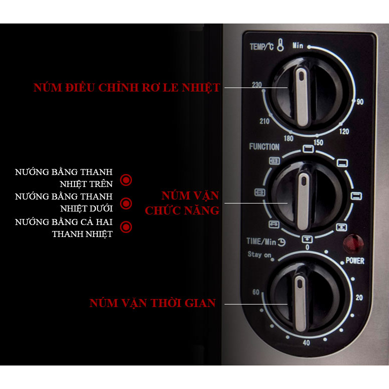- Chức năng nướng: Nướng trên; nướng dưới; nướng trên + dưới; nướng trên dưới đối lưu; nướng trên đối lưu; nướng trên xiên quay; nướng trên + dưới xiên quay; nướng trên + dưới xiên quay + đối lưu