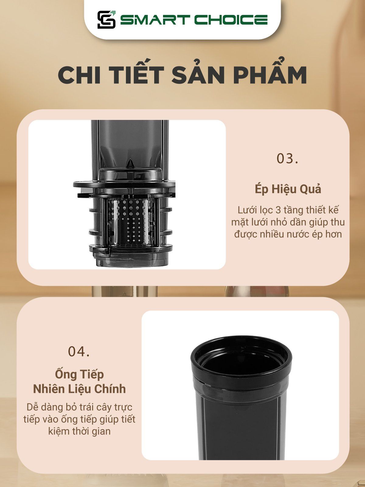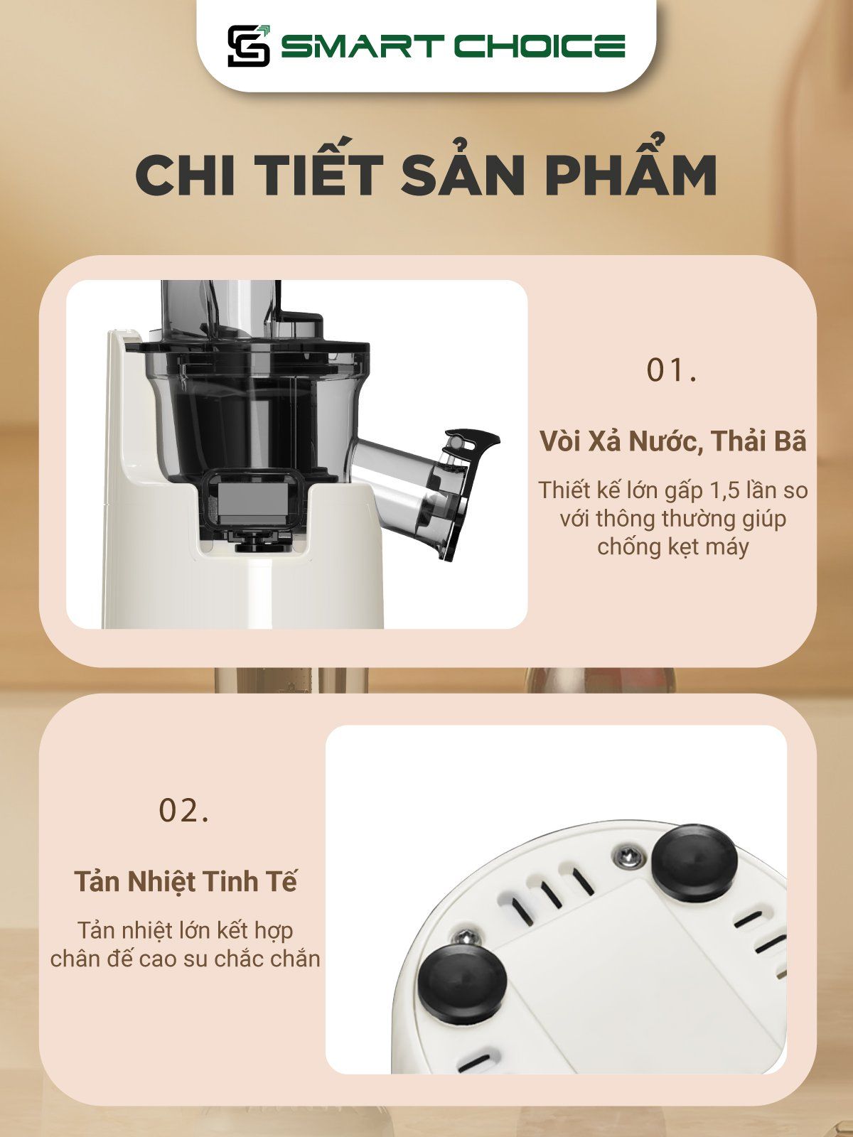 Máy ép chậm SmartChoice SCG-EC002 là một trong những thiết bị gia dụng nổi bật, được thiết kế để mang lại những ly nước ép tươi ngon và bổ dưỡng. Với công nghệ ép chậm hiện đại, sản phẩm này không chỉ giữ được hương vị tự nhiên của trái cây và rau củ mà còn bảo toàn tối đa lượng vitamin và chất dinh dưỡng. Hãy cùng tìm hiểu những điểm nổi bật của máy ép chậm SmartChoice SCG-EC002 và lý do tại sao nó lại là sự lựa chọn tuyệt vời cho mọi gia đình.