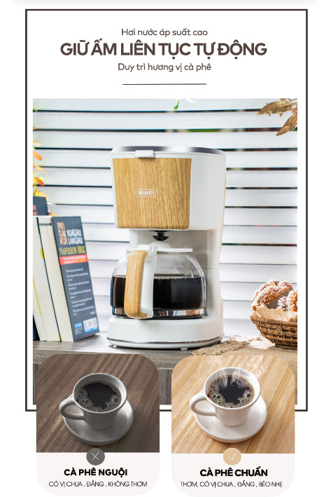 Máy pha cà phê Winci CM1142 dẫn đầu trong dòng máy pha cà phê nhỏ giọt dành cho gia đình, với công suất 900w, thiết kế sang trọng từ gỗ, hiệu suất pha đáng kinh ngạc, mang lại những ly cà phê thơm ngon chất lượng vượt trội