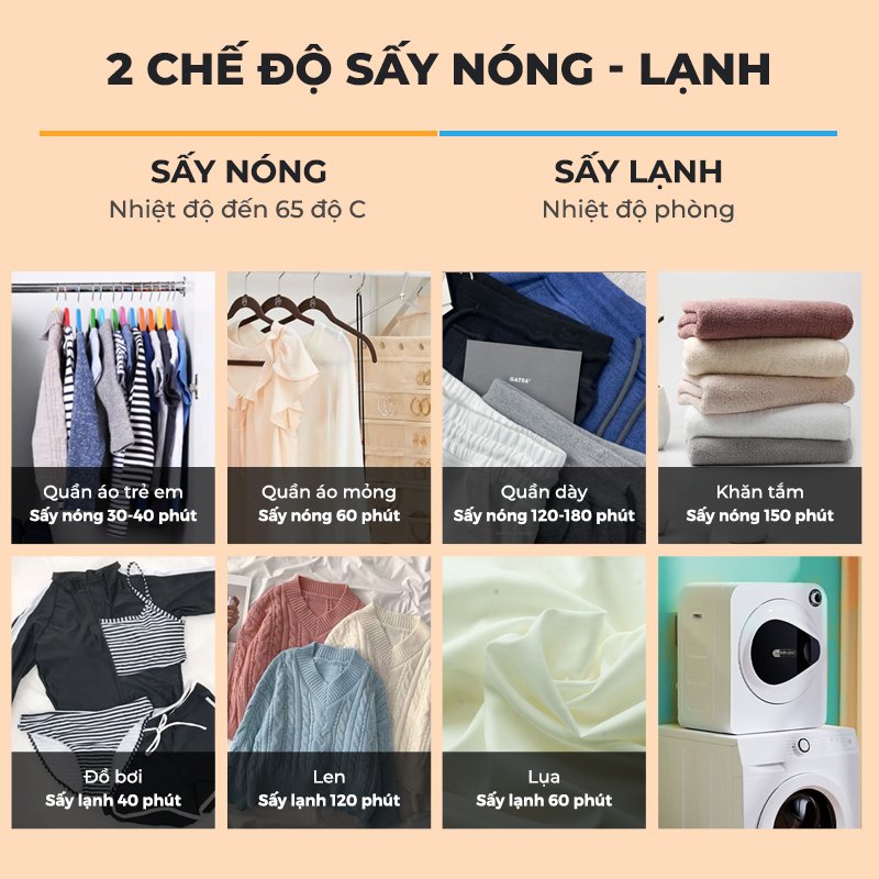 2 Chế độ Sấy Nóng - Lạnh riêng biệt: Sấy nóng đến 65 độ C, giúp quần áo khô ráo chỉ từ 1-2 giờ. Sấy lạnh giúp bảo vệ quần áo từ các chất liệu cao cấp như vải lụa, vải len, đồ bơi,...