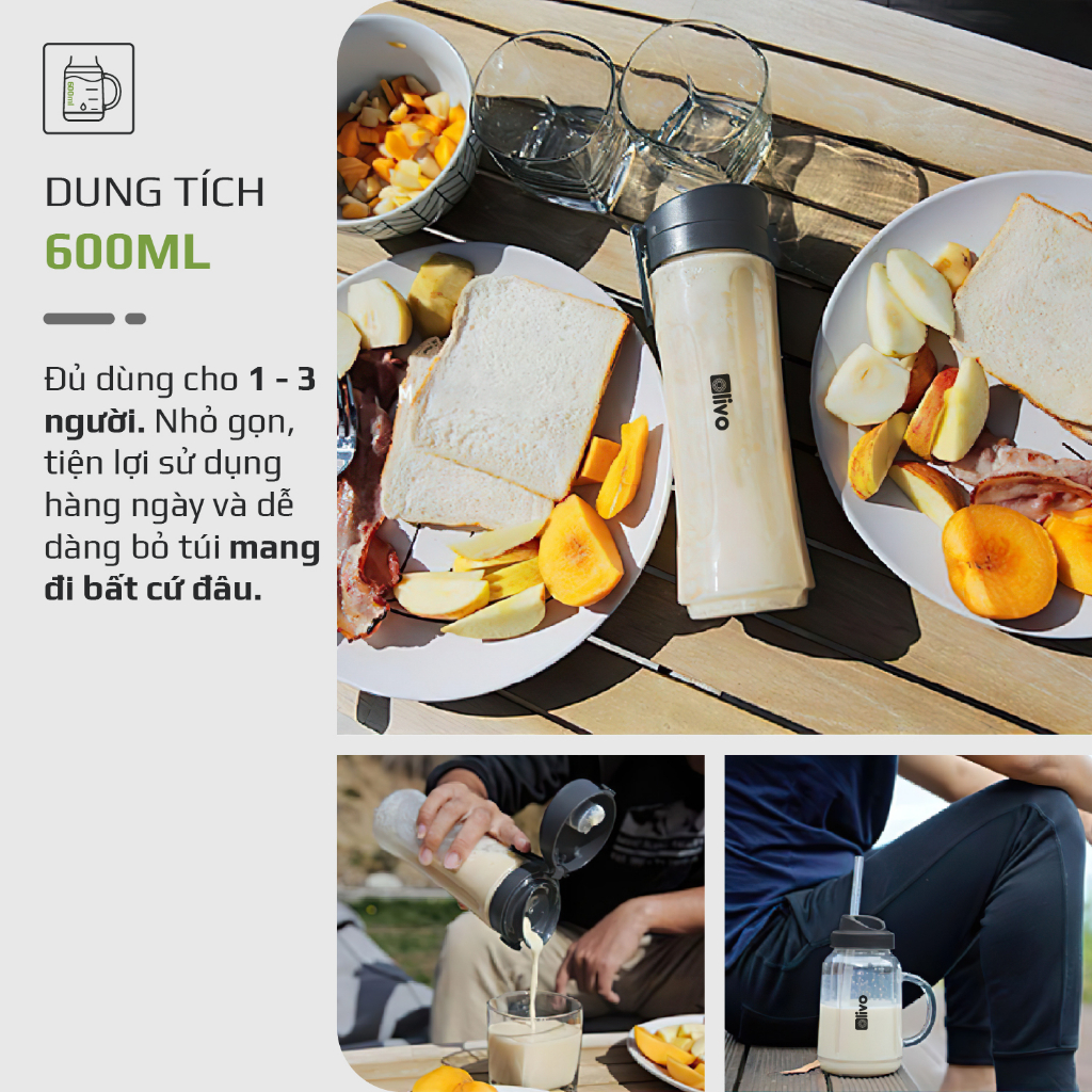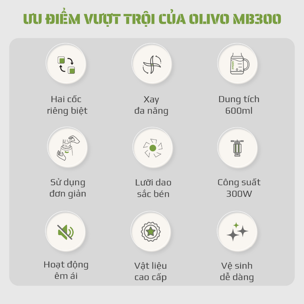 – OLIVO MB300 là một chiếc máy xay sinh tố mini với thiết kế nhỏ gọn, tiện lợi. Máy có dung tích 600ml, đủ dùng cho 1-3 người.