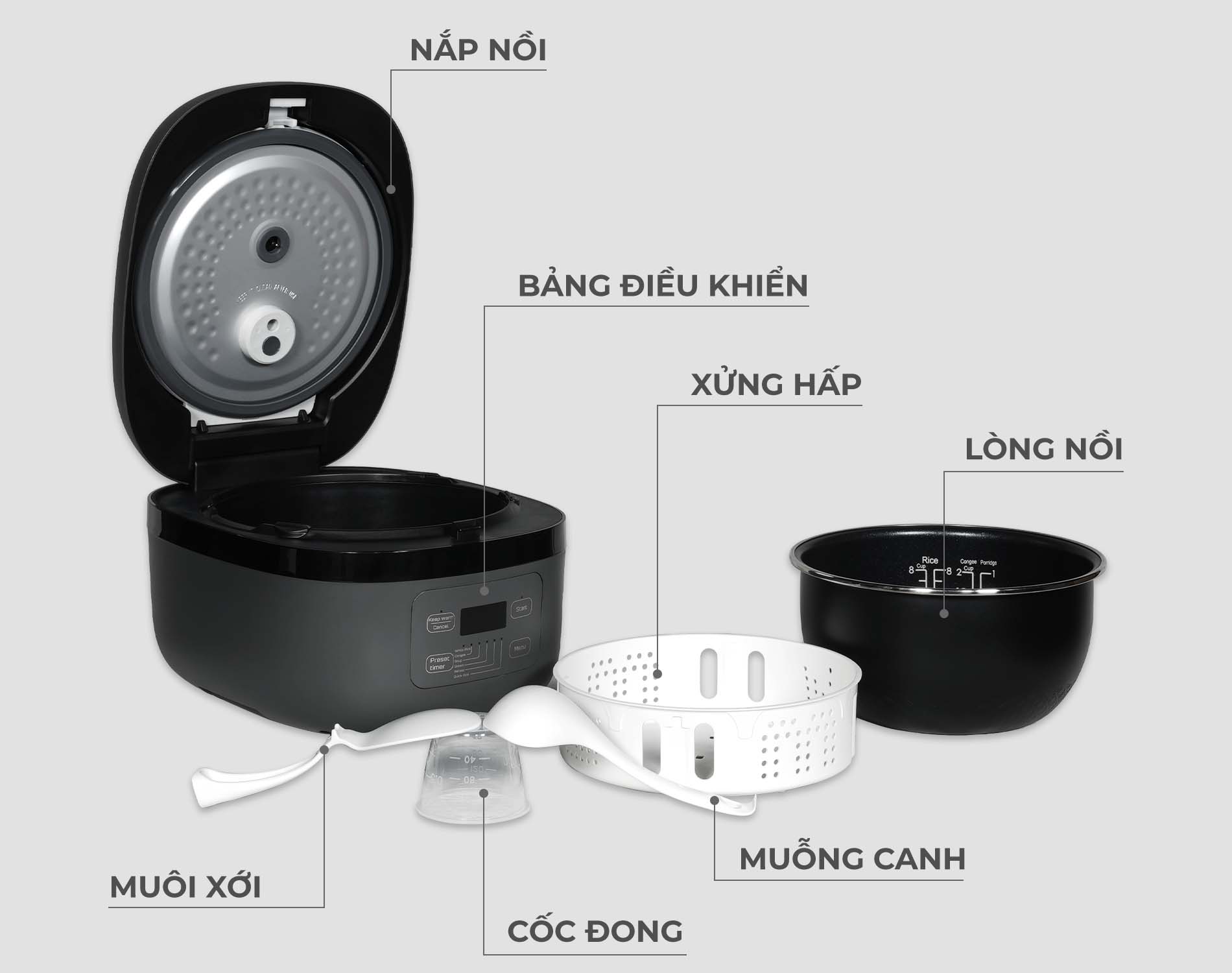 | Phụ kiện đi kèm | Muỗng cơm, muôi canh, cốc đong, khay hấp, dây nguồn, sách HDSD |