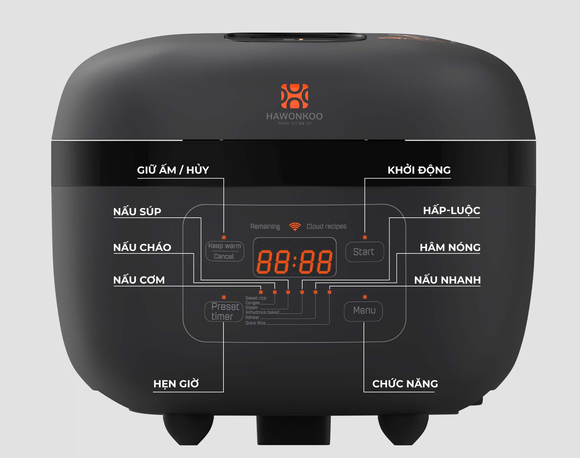 RCH-152-IH có 7 chức năng với 6 chế độ nấu đặc biết đa dạng. Chế độ giữ ấm và 6 chức năng nấu bao gồm: Cơm trắng, Súp, Hấp, Cháo, Hâm nóng, Nấu cơm nhanh. Ngoài ra, cũng có thể tự điều chỉnh thời gian cho mỗi chế độ bằng cách nhấn nút Preset timer và hẹn giờ nấu mong muốn.